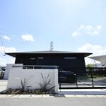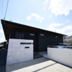 モダンな現場が舞台で、黒い建物に合うように黒色の丈夫なフェンスを施工しつつ、おしゃれなワンポイント植栽を添えた新築外構工事です。